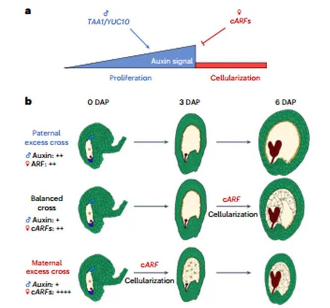 胚乳是一种生殖组织,来源于单倍体精子细胞与以二倍体为主的中心细胞的融合,支持胚胎的发育。在大多数开花植物中,胚乳细胞核的初始分裂不是通过细胞化来完成的;这个过程只有在特定数量的有丝分裂周期发生后才会发生。细胞化的时间显著影响种子的活力和大小。先前的研究表明生长素是启动细胞核分裂和决定细胞化时间的关键因素。在这里,研究者们揭示了一个簇状生长素反应因子家族(cARFs)作为胚乳细胞化的剂量敏感调节因子