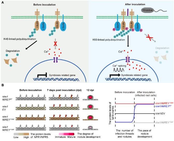 根瘤固氮是自然界中氮素还原效率最高的一种形式,为宿主作物提供绝大部分的氮素来源。豆科植物—根瘤共生固氮体的建立起始于宿主植物对根瘤菌结瘤因子的识别。结瘤因子受体是由两个LysM受体激酶(如百脉根中NFR1和NFR5)形成的异源复合物构成,其介导的共生信号转导对于根瘤菌入侵和根瘤发育起到决定性作用。然而,结瘤因子受体在蛋白水平上的调控机制并不清楚。2024年5月31日,华中农业大学曹扬荣教授团队在M