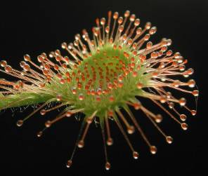 毛毡苔(Drosera rotundifolia)外观柔弱,叶上佈满腺毛,腺毛上有黏液,可以捕食昆虫。荷兰瓦赫宁恩大学和莱顿大学联手开发了一款创新捕虫剂。他们以植物食用油为基底,让它氧化,变成浓稠的黏性液体后,再喷洒到叶片上,模仿毛毡苔这类食虫植物的黏虫液滴,抓住小害虫。放大看圆叶毛毡苔,上面有许多黏性小液珠,可捕食昆虫。图片来源:Petr Dlouhý(CC BY-SA 3.0)借镜食虫植物,除