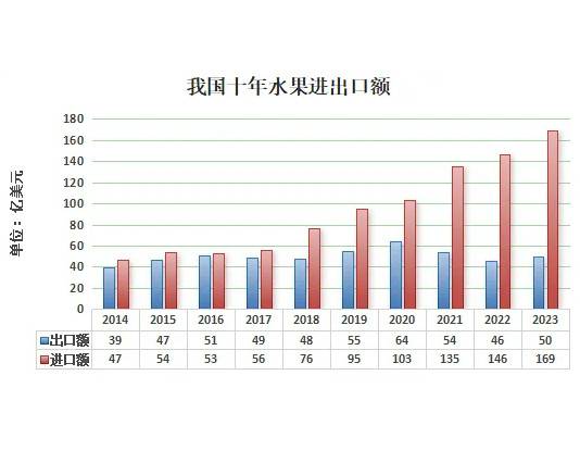 自从2018年起,我国水果贸易逆差激增,此后不断扩大。根据食土商会水果分会发布的最新统计数据,2023年我国水果进出口双增长,其中进口额超168亿美元,继续保持快速增长态势。01进出口概况2023年我国水果进口金额达到168.5亿美元,同比增长15%。进口数量752.4万吨,同比增长3%。在水果出口方面,2023年出口金额49.8亿美元,同比增长8%,出口量386.8万吨,同比增长19%。相比近1