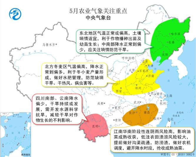 预计5月,东北农区大部气温接近常年同期或偏高,土壤墒情适宜,有利于春玉米、大豆播种出苗和一季稻育秧移栽;但辽宁和吉林大部温高雨少,且春季风大,失墒速度快,部分地区可能旱象露头,需加强防范。北方冬麦区大部水热条件良好,墒情适宜,利于小麦产量形成;但华北、黄淮东部等地气温偏高,出现干热风天气风险高,同时河北南部降水偏少,土壤可能出现缺墒,需密切关注墒情变化适时灌溉,并做好一喷三防降低干热风影响。西北地