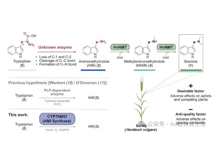 大麦是全球最重要的谷类作物之一。许多大麦栽培品种会产生一种名为"禾草碱"的有毒生物碱,这种生物碱会影响大麦作为饲料的适宜性,但也有助于保护大麦免受病原体的侵害。迄今为止,由于大麦产生禾草碱的遗传基础尚未解决,因此还没有将操纵禾草碱水平的潜力用于植物育种。现在,来自德国 IPK 莱布尼茨研究所John D’Auria和汉诺威莱布尼茨大学Jakob Franke的研究团队揭示了禾草碱的完整生物合成途径