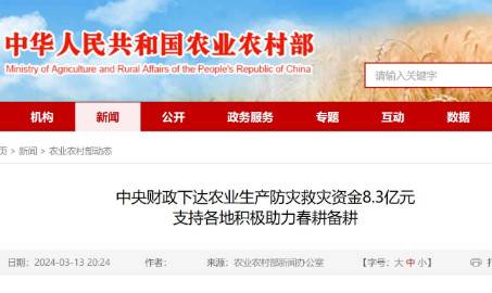 按照党中央、国务院有关决策部署,为支持各地积极应对相关农业灾害带来的影响、助力春耕备耕,财政部会同农业农村部于近日下达中央财政农业生产防灾救灾资金8.3亿元,支持江苏、安徽、河南、湖北、湖南等12省(区)加快做好农作物改种补种、农业及畜牧渔业设施灾损修复等相关防灾减灾救灾工作,为促进夏季粮油生产开好头、起好步提供有力支撑。