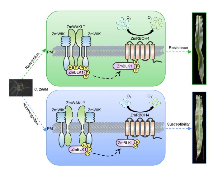 植物具有一套复杂的防御机制,用以接收和传导免疫信号并激发抗病反应。植物模式识别受体(Plant Pattern Recognition Receptors, PRRs)是一类位于细胞质膜上的受体蛋白,能感知病原体入侵并触发寄主免疫响应,如活性氧(Reactive Oxygen Species, ROS)的爆发。细胞壁相关激酶(Wall-Associated Kinases, WAKs)和WAK类激