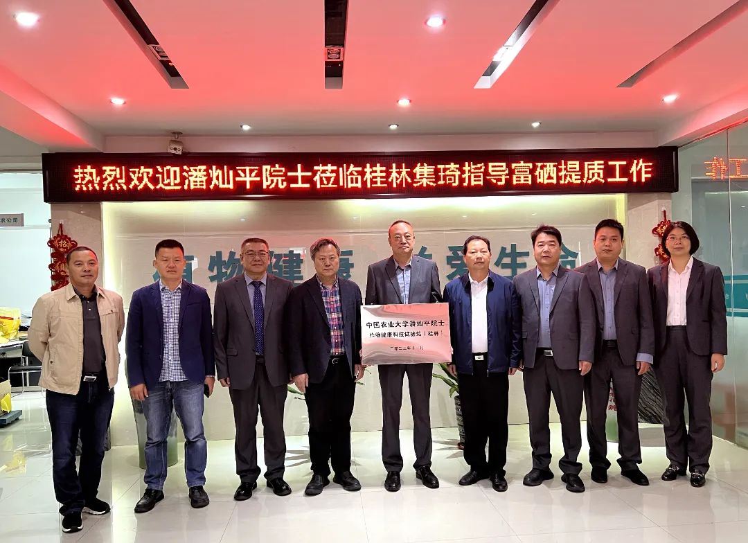 11月6日,中国农业大学教授、俄罗斯工程院士潘灿平莅临桂林集琦生化指导富硒提质工作,同步为“中国农业大学潘灿平院士作物健康科技试验站(桂林)”进行揭牌,桂林七星区党委、政府主要领导、市农业农村局领导、桂林恭城鹏宇兄弟果业公司总经理柴寿海参加此次活动。▲“中国农业大学潘灿平院士作物健康科技试验站(桂林)”揭牌仪式此次试验站揭牌标志着中国农业大学与桂林集琦生化在富硒农业战略合作上迈出全新步伐,必将带动