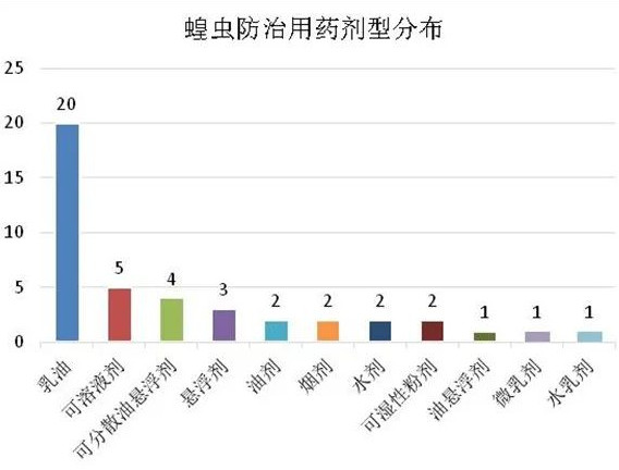众所周知蝗虫是一种世界性的农业害虫,其分布广泛,危害极大。多年来我国在治蝗灭蝗方面多措并举,效果显著,这里面就有农药的功劳。时至今日,飞蝗和其他迁移性蝗虫仍被列入我国一类农作物病虫害名录,足见其防控工作任重道远,蝗虫防治用药登记仍有可为。今天小编梳理了目前国内蝗虫类防治用药登记情况,以供参考。据查中国农药信息网,目前登记用于防治蝗虫类的农药共43个,包括单剂39个和混剂4个。涉及剂型11种,登记最