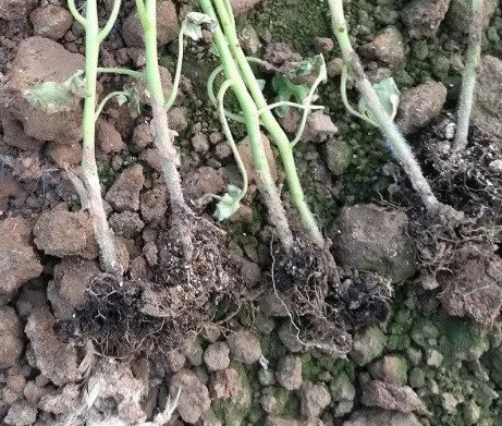 2020年9月8日,澳佳生态的农化专家与昌乐亿嘉瓜菜专业合作社刘经理去昌乐下面大棚户回访。半道被一个种棚小伙子给拦下了,要求我们给测测土,看看他家的棚怎么回事?我们一进棚,就闻到刺鼻的臭味,看见圣女果小苗刚栽下三天,大水漫灌后还很湿,他说小苗不仅没长,而且陆陆续续就开始死亡,很着急,不知道什么原因?我们拔出幼苗,看见没有新根长出,老根已坏死,我们帮他检测土壤,发现盐分和PH值都偏高,询问农户用了什