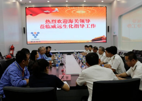 9月26日,海关总署第一巡回督导组组长杨占强、石家庄海关副关长王蔚冰、正定海关关长兰文杰等一行10人莅临利民股份子公司威远生化指导工作,利民股份总裁范朝辉、威远生化总经理李立华、利民股份市场营销总监高军从、威远生化副总经理高永民、国际营销中心总经理助理朱秀梅、品质管理部主任郑杰等领导陪同接待。调研走访座谈会上,总经理李立华对威远生化的发展历程、企业管理、生产运营进行了详细介绍。海关总署第一巡回督导