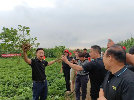 2023年8月24日,河南省南阳市方城县,澳佳生态在这里举行了一场二级经销商会议。早上7点半客户坐上三辆巴士,去往方城县赵河镇肖营村栾永力家的花生地里参观施用澳佳壤动FT拌种的花生长势,一行五十多人来到地里后,第一眼对花生的长势并不看好,没有特别之处,花生地里还有杂草,通过了解原来地主对这块地是粗放式管理,并没有做到精细管理,但是花生拔出来后,每一穴几乎都有70-80个果,大家对花生的结果量是非常