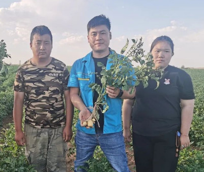 同品种的马铃薯长势区别能有多大?7月17日,根力多董事长王淑平来到古浪雪川马铃薯种植基地。“我拿的是用过碳能包的土豆实验田(雪川23品种),用了两次碳能包,第一次2公斤,第二次3公斤,马上用第三次4公斤。另外一棵是对照田的同品种。”王淑平告诉我们示范田的马铃薯比对照田晚种了4天,但目前使用根力多碳能包的马铃薯长势却远超对照田,秧子长势更健壮、根系更发达,随机拔出的一棵马铃薯上挂了14个“金豆”,几