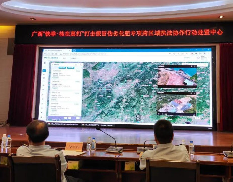 7月2日,广西壮族自治区市场监管局综合执法局组织南宁、柳州、百色、贺州市市场监管局在玉林市开展广西“铁拳•桂在真打”打击假冒伪劣化肥专项跨区域执法协作行动,对前期通过遥感卫星监测到的玉林市部分涉嫌生产“问题”化肥的企业进行执法检查。先后查处“问题”化肥200多吨,并将企业可能存在的违法经营线索,移交玉林市场监管部门立案调查。7月2日14时,设置在玉林市市场监管局的“广西‘铁拳•桂在真打'打