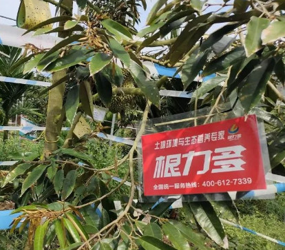 中国榴莲市场方兴未艾,国内刮起一波种植热潮。但是榴莲的生长对于气候、土壤等都有着非常高的要求,不仅冬季气温低不利于果树开花结果,夏季的干热气候也会对榴莲的生长产生不利影响。6月4日,根力多董事长王淑平来到海南优旗农业有限公司万亩榴莲基地进行实地调研,发现榴莲果树上出现干枯、焦叶的现象,榴莲树长势相对萎蔫。为帮助海南优旗公司解决问题,王淑平组织技术服务团队研讨后,制定了一整套试验方案。6月10日,海