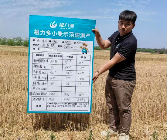 “一般多的地,为什么产量不一样?”近日,在河北省沧州市献县的根力多小麦示范田里,我们进行了现场实打实收,只为获取真是数据。一大早,根力多的示范田里就聚集了很多慕名而来的农户朋友们,大家热情洋溢,都想亲眼看一看根力多小麦实打实收的产量结果。在当地代理商曹春来的带领下,我们看到示范田和对照田的明显差别。对照田看到小麦长势高低参差不齐,且麦穗发黑,摘下一穗搓开看麦粒,有霉变的现象。再看示范田,长势整齐,
