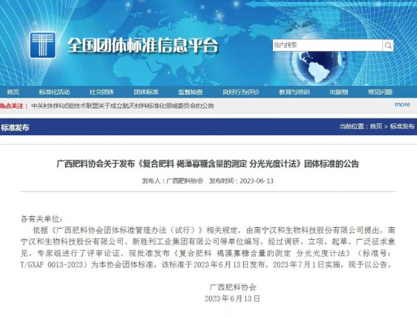 2023年6月13日,由南宁汉和生物科技股份有限公司起草的《复合肥料 褐藻寡糖含量的测定 分光光度计法》(标准号:T/GXAF 0013-2023)团体标准经广西肥料协会批准发布,将于2023年7月1日正式开始实施,这是行业内一份关于褐藻寡糖产品的标准! 褐藻寡糖(AOS),是褐藻胶(海藻酸)通过褐藻胶裂解酶等裂解反应得到的线性低聚糖,聚合度一般在2-7,高活性的聚合度2-4,分子量在1