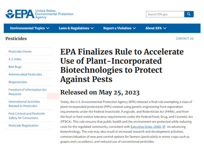 美国环境保护署(US EPA)在5月25日发布公告与指南,宣布针对两类采用新型生物技术的基因编辑作物明确了批准的豁免条件,该要求的发布意味着EPA将对植物嵌入式农药(Plant-incorporated protectants, PIPs)的监管细化,以促进基因编辑育种行业的合规性。本文概要总结了美国对于基因编辑育种监管的转变和评估体系,并重点探讨和分析了本次最新动态以及后续影响,以期为