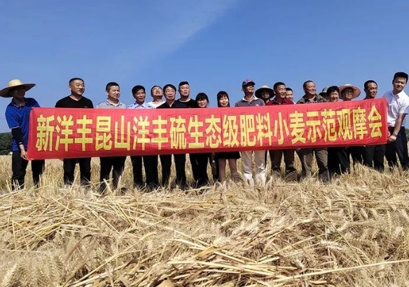 5月25日,新洋丰江苏销售分公司联合昆山市高素质农民协会,在昆山市淀山湖镇晟泰村殷春齐的小麦田召开“洋丰硫”小麦实收测产观摩会,30多位种植大户前来观摩。示范田实收后折合亩产湿小麦724.7 kg,对照田实收后折合亩产湿小麦640.3 kg;示范田小麦水分含量26.8%,对照田小麦水分含量30.1%,按国标水分含量12.5%折算后,洋丰硫小麦示范田较对照田亩增产97.9 kg,增产比例20.77%