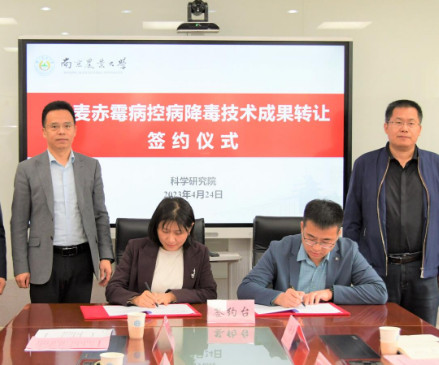 4月24日,南京农业大学已获授权的国家发明专利“一种增效减量农药组合物在防治麦类赤霉病中的用途”(ZL201610036814.X)独家许可给山东滨海瀚生生物科技有限公司,并在南农大科学研究院举行了签约仪式。此次“双向奔赴”“一拍即合”的战略合作,将为我国小麦赤霉病高效、绿色防控增添新利器。