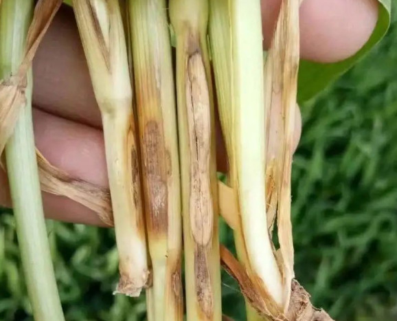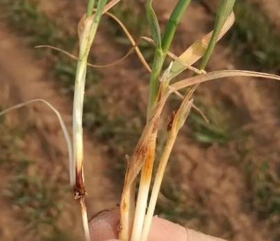每年小麦返青后,有些田块会零星或成片儿出现干尖、黄叶甚至死苗现象,叶鞘变褐色,严重时根部变褐腐烂,很多农户搞不清楚是什么原因,甚至怀疑是不是除草剂药害、或者浇返青水时的追的肥料有问题,其实,很多时候是茎基腐病引起的。小麦生长后期,受害麦田多出现零星的单株麦子死亡的白穗现象,直接影响了小麦的产量和品质。(图片来自网络)1、危害特征小麦茎基腐病的主要侵染部位为小麦的茎基部位与根部,同时,从小麦分蘖期到
