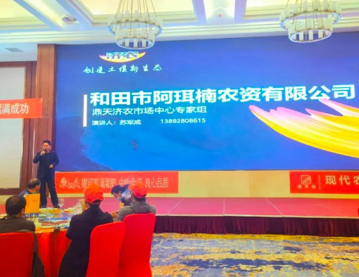 2023年3月31日,和田市阿珥楠农资有限公司在和田市迎宾馆召开了春季启动会,近200零售商及种植大户前来参会。陕西鼎天济农腐殖酸制品有限公司技术专家苏军成、杨景社,新疆富莱格农林科技有限责任公司新疆市场服务经理李海同、张跃钟、邓华超、曹鑫一行参加了本次会议。 会上,苏军成老师针对新疆盐碱地的特性、种植户的痛点难点等问题进行讲解,分享了济农高浓度腐植酸产品“济农乐土”是如何改