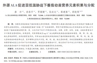 2022年4月,西北农林科技大学康珍等发表文章《外源ALA促进亚低温胁迫下番茄幼苗营养元素积累与分配》。研究表明,外源预喷施25mg/L ALA缓解亚低温造成的番茄幼苗氮、磷、钾、钙、镁、铁元素吸收障碍,提高元素的吸收水平;且通过减弱亚低温造成的番茄幼苗叶片叶绿素含量下降,缓解亚低温对植株营养生长的抑制。1. 外施ALA对亚低温胁迫下番茄幼苗叶片叶绿素含量的影响 清水+常温(