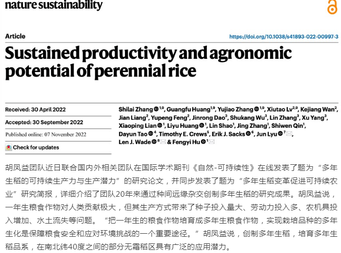 记者日前从云南大学了解到,云南大学胡凤益团队利用多年生野生种和一年生栽培种杂交,把长雄野生稻地下茎无性繁殖特性转移到一年生栽培稻中,成功培育成多年生稻栽培品种并进行商业化生产。专家认为,该研究是我国种质资源创新利用领域具有代表性的突破之一,为利用野生种质资源提供借鉴,也为粮食生产提供了一种新途径。胡凤益团队近日联合国内外相关团队在国际学术期刊《自然-可持续性》在线发表了题为“多年生稻的可持续生产力