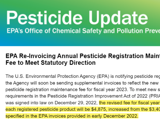 2022年12月23日,美国国会重新授权《农药注册改进法案》(The Pesticide Registration Improvement Act,即PRIA 5)。即根据PRIA 5新法案要求, 为支持农药项目办公室 (Office of Pesticide Programs,OPP)的工作,EPA官方评审费和年度维护费将上涨,预计评审费每年总计将增加600万美元,年度维护费每年总计将