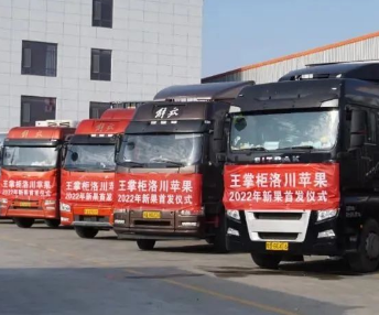 中国苹果看陕西,陕西苹果看洛川。洛川苹果已经超过烟台苹果,成为国内知名度较高的水果品牌。“一切就绪,出发……”11月1日,陕西王掌柜农业发展有限公司院内,21辆苹果冷链车排着队整装待发,450吨洛川苹果将走向全国各地。“今天是我们企业今年洛川苹果的首发仪式,主要是发往北上广深还有湖南湖北等全国十多个省份。2022年至2023年我们预计销售洛川苹果在15万吨,呈现双倍的一个增长速度。”陕西王掌柜农业