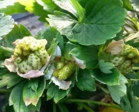 草莓畸形大大影响了草莓的商品价值,种植朋友们苦不堪言,草莓畸形的主要类型有:僵化果、双身果与鸡冠果、裂果、白化果、空心草莓、草莓白腚等。僵化果僵化果表现为果实极小,口感差、木栓化、质地硬的生理成熟果。僵化原因:草莓植株生长不良,同化物质供应不足,或者结果过多,失去营养竞争能力。如在草莓花芽分化期遇到25℃以上或5℃以下高温或低温,则使花芽分化受阻,形成畸形花,进而发育成畸形果。另外,开花结果期温室