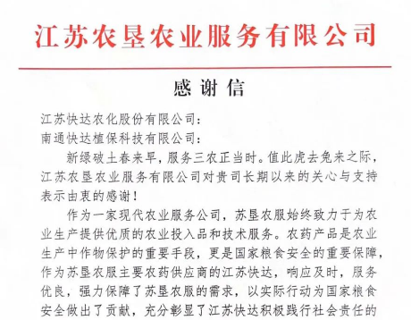 新年伊始,江苏快达农化股份有限公司、南通快达植保科技有限公司同时收到了来自江苏农垦农业服务有限公司的新年感谢信,对快达农化及快达植保公司长期合作相互关心、支持和服务,表示了由衷感谢!作为江苏农垦农服长期合作伙伴,快达农化响应及时,植保公司服务优良,强力保障了苏垦农服需求,以实际行动为国家粮食安全做出了贡献,充分彰显了江苏快达积极践行社会责任的企业担当,充分诠释了双方“精诚合作、同心奋斗”的合作精神