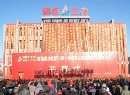 2017年12月27日,腐植酸功能肥与黑土地保育及盐碱地治理高峰论坛暨澳佳生态东北生产基地开业庆典,在吉林松原市举行。来自农业部、中国农科院、中国植物营养与肥料学会、中国腐植酸工业协会、中国矿业大学的领导和专家,以及来自黑龙江、吉林、辽宁、江苏、河南、山西、山东、福建等省市的农资经销商和种粮大户200多人汇聚一堂,共商腐植酸功能肥如何保育黑土地和盐碱地治理大计。专家纵论盐碱地治理在腐植酸功能肥与黑