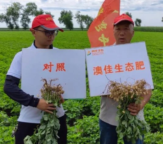 又快到了花生的收获季节,可今年却是几家欢喜几家愁!由于长达一周的阴雨天,吉林松原许多农户的花生长势并不好,叶片发黄下针少。而前郭尔罗斯蒙古族自治县的花生种植大户赵辉大哥却非常自信,原因是他的今年种的15亩花生全程用澳佳高产方案,长势与邻居家的花生截然不同。澳佳工作人员2022年8月16日回访赵大哥家的花生时,赵大哥脸上写满了骄傲,自信满满地说:你看,我的15亩花生只用了12袋澳佳13-18-15腐