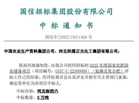 2022年国家化肥商业储备分为氮磷及复合肥储备、钾肥储备两部分,是国信招标集团受国家发改委经济贸易司、财政部经济建设司的委托进行的国内邀标。在获悉国家化肥储备项目招标的相关信息后,正元集团销售分公司第一时间与中农集团沟通,通过洽谈确定两家作为联合体进行投标,并迅速组织人员进行投标准备工作,经过收集大量资料,第一时间完成并投递了招标文件。 8月30日,国信招标集团股份有限公司发布中标通知书,河北正