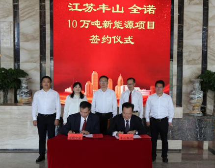 2022年8月11日上午11:18,江苏丰山集团股份有限公司(以下简称“丰山集团”)与南通全诺新能源材料科技有限公司(以下简称“南通全诺”)10万吨新能源项目签约仪式在丰山集团总部大楼成功举行。盐城市大丰区委副书记、区长戴勇,大丰区委常委,副区长房其勇,区委常委、江苏大丰港经济开发区党工委书记、管委会主任黄同城,大丰港石化新材料产业园管理办公室主任夏伟,江苏丰山集团董事长殷凤山、总裁殷平,南通全诺