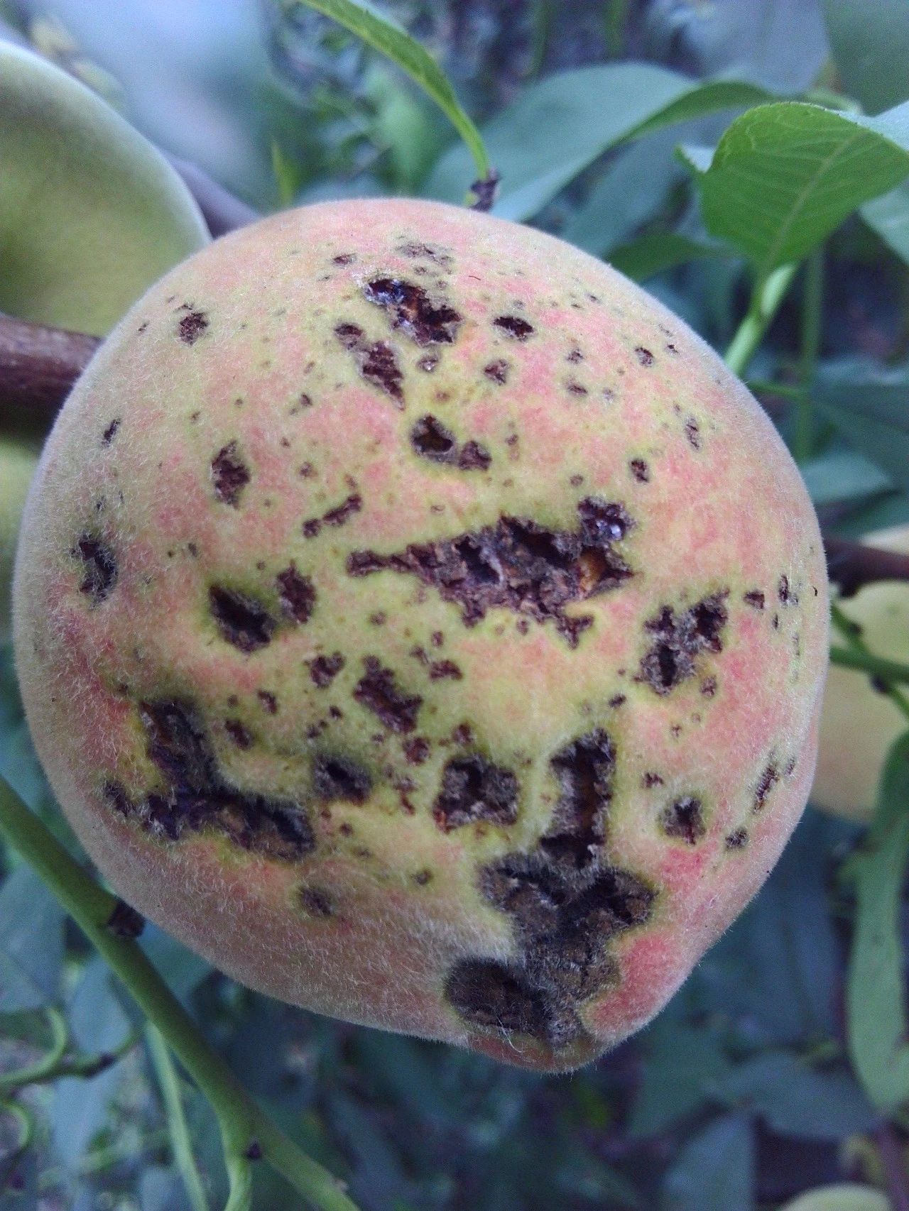 桃树的病害很多,其中疮痂病对对品质的影响很大,若及早抓紧防治该病是可预防的,若掉以轻心就会造成很大的损失。 疮痂病又称黑星病,属真菌性病害,主要危害桃树的果实,有的地方也危害到桃树的新梢和叶片。早熟品种因为生育期较短危害程度较轻,中、晚熟品种危害较重。 桃黑星病—发病枝条桃黑星病—灰色病斑桃黑星病—果实肩部产生大量近圆形病斑桃黑星病—果实肩部产生大量近圆形病斑桃黑星病—油桃病果