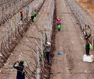 春天是葡萄生长的关键时期,萌动、展叶、开花、坐果都在这时期进行,因此春季葡萄生长状态的好坏直接影响到秋天的收获。安全出土。今年春天地比较干,地温也没有起来,出土过早的话,会造成葡萄枝条抽干,发不出芽,尤其是冬灌水浇得不好的园区。要求春季分两次出土,第一次出土在杏花露白时,去掉枝条上大部分覆土,但仍确保枝条上有少量的土壤覆盖,利于枝条保湿;第二次出土在杏花开的时候,此时已经施肥浇水,土壤湿度大,不容