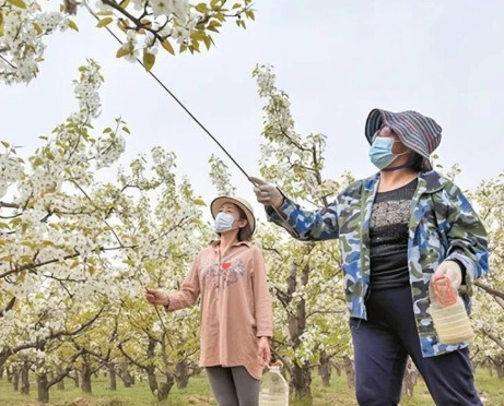 梨树人工授粉仍是十分有效的提高坐果率的技术措施。但人工点授所耗劳动力太多,不适宜大面积推广应用。采用液体授粉是一项低成本、高效率的授粉技术。可按照100公斤水,20克黄原胶、50克硝酸钙、10克硼酸、13公斤白糖、商品精花粉40-80克的比例配置(该配方由南京农业大学、国家梨产业技术体系首席专家张绍铃团队研发)。近些年梨树病虫害发生呈越来越严重趋势,喷药次数越来越多、用药浓度越来越高,但防治效果却