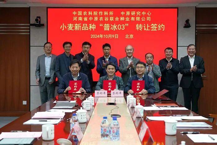 10月9日,中国农业科学院作物科学研究所、中原研究中心与河南省中原农谷联合种业有限公司在京举行小麦远缘杂交新品种“普冰03”使用权转让协议签约仪式。中国农业科学院党组书记杨振海、中国工程院院士刘旭、中国科学院院士钱前、新乡市副市长刘军伟出席会议并讲话。杨振海充分肯定了作科所在作物种质原始创新方面的贡献,他指出,保障国家粮食安全关键在科技,种质创新是种业振兴的关键所在。中国农业科学院将进一步加强与河