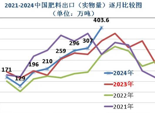 中国海关初步统计数据显示,2024年1—8月中国累计出口各种大量元素肥料1971.3万吨,同比增幅为4.4%;出口金额52.41亿美元,同比降幅为13.9%。8月当月中国出口各种肥料403.6万吨,出口金额11.20亿美元;当月出口报送平均离岸价为277.53美元/吨。受副产氮肥等品种出口持续增长影响,8月份单月出口量首次突破400万吨,创中国历史最高记录。进口方面,2024年1—8月中国累计进口