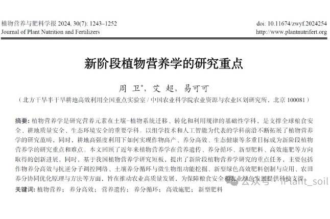 一 新阶段植物营养学的发展目标1 作物养分高效—解析养分高效的遗传基础与调控网络作物养分高效的基础在土壤环境,根本保障在 作物自身遗传特性。因此,作物养分高效的分子遗 传调控基础一直是农业科学研究领域的热点和难点。具体包括:1) 氮、磷、钾等大量元素的信号转 导、吸收转运、代谢利用等分子遗传调控机制,通过养分高效的遗传改良和分子手段挖掘优异种质资源,旨在提升作物产量和品质,保障粮食安全;2) 铁、