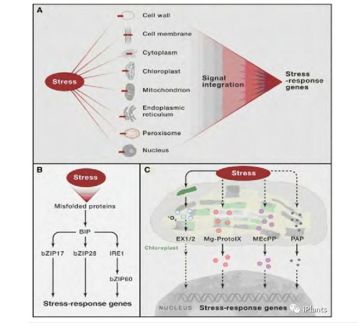 iPlants公众号:作为固定的生物,植物必须适应土壤盐碱害、干旱以及极端温度等非生物胁迫。植物主要胁迫信号途径与酵母SNF1激酶和哺乳动物AMPK激酶有关,显示这些途径可能由能量感知途径进化而来。胁迫信号通过调控离子和水的运输,代谢和转录重组过程中的关键蛋白以维持胁迫条件下离子和水的动态平衡,保持细胞的稳定。对非生物胁迫的信号传递和应答过程的深入了解将有助于提高作物的逆境适应能力,实现农业的可持