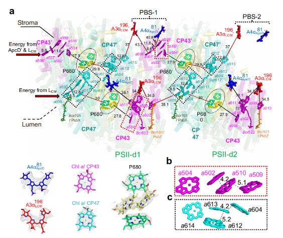 藻胆体(phycobilisome, PBS)是蓝藻和红藻主要的捕光天线,通过共价连接的色素团(bilins)将捕获的光能以极高的效率传递至光系统II(photosystem II, PSII)和光系统I(photosystem I, PSI)的反应中心以诱导光-化学能量的转化。虽然大多数光合作用相关蛋白复合物的结构已通过体外纯化的方式得到了解析,但在细胞内的天然状态下它们之间相互作用的方式以及能