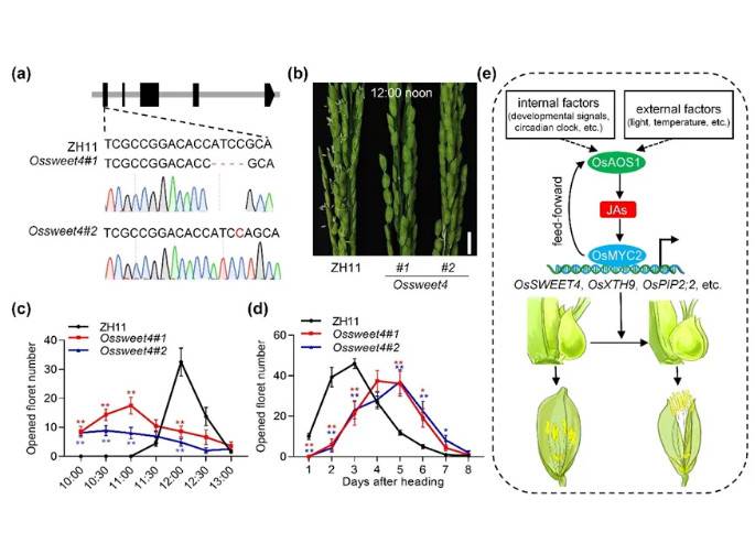 水稻颖花开放时间(花时)是指水稻扬花期颖花在一天中的开花时间或开花持续时间。水稻花时是水稻生命周期中一个关键的时期,涉及雄蕊花丝伸长、花药开裂、花粉释放以及授粉,这些活动对植物受精结实至关重要。开花植物能够根据外界环境变化调整自身花时,从而提高植物的适应性。花时也是控制水稻杂交制种效率的关键农艺性状。在杂交稻生产中,恢复系是花粉供体,雄性不育系是花粉受体。只有当双亲颖花的开花时间相遇时,才能高效地