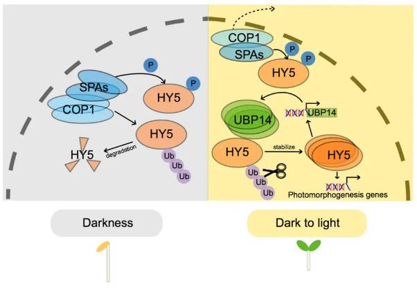 作为光合自养生物,植物对光环境高度敏感。光是最关键的环境因素之一,不仅是能量来源,而且是植物发育过程中的决定因素。当幼苗破土而出,照射在阳光下,需要迅速打开顶端弯钩和子叶,抑制下胚轴的生长,促进子叶扩张和叶绿素积累,为光合自养生长做准备,该过程被称为光形态建成。bZIP型转录因子ELONGATED HYPOCOTYL5(HY5)是幼苗光形态建成的中心枢纽,也是抑制下胚轴生长的关键因子。从暗到光下的
