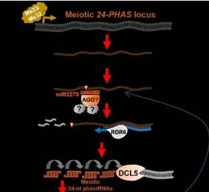 玉米等禾本科作物的花药中大量积累两种不同大小的phasiRNA (21 nt和24 nt),其中21-nt phasiRNA主要在减数分裂前积累,因此也被称为premeiotic phasiRNA,24-nt phasiRNA主要在减数分裂发生时积累,也被称为meiotic phasiRNA。这两种已知的phasiRNA都源自基因组的非编码区域,由两个不同的生物合成途径产生。水稻、玉米等作物中的前