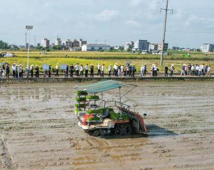 7月25日,广西贵港市港北区大圩镇新建村,一台无人驾驶的插秧机吸引关注。“2024年全区智慧农业、农机应急救灾现场推进会”当日在位于新建村的广西首个“无人农场”——广西贵港市益农水稻智慧农场举行,现场演示了水稻耕整、种植、田间管理(水、肥、药)和收获环节全程无人化作业。(无人机照片)中新社记者 陈冠言 摄7月25日,广西贵港市港北区大圩镇新建村,一台无人驾驶的插秧机在田间作业。“2024年全区智慧