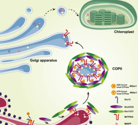 核基因编码叶绿体蛋白分为细胞质合成和内质网合成。细胞质合成的叶绿体蛋白的转运机制已有大量研究:其蛋白的N末端具有叶绿体转运肽,由细胞质分子伴侣识别并转运至叶绿体表面,通过叶绿体被膜两侧的整合膜复合体TOC和TIC进入叶绿体。然而对于没有典型的叶绿体转运肽、在内质网合成的蛋白转运至叶绿体的分子机制却知之甚少。近日,中国农大生物学院王涛、董江丽团队在The Plant Cell