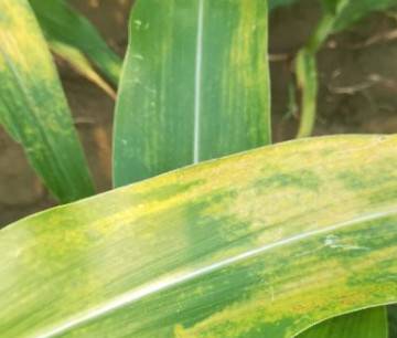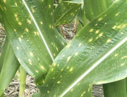褐斑病是近年来玉米田常发的真菌性病害,于玉米小喇叭口期即可侵染。该病主要危害玉米叶片、茎秆及叶鞘,严重时可使叶片枯死,一般减产10%左右,严重时达30%以上。褐斑病病原初侵染时,叶面出现白至黄色水渍状病斑,随后发展,愈合成片,垂直于主脉,形成带状褪绿感病区,与健康组织相间。感病区主脉增生褐色凸斑,主叶脉上常有线段状黑斑。后期病组织褐变加重,并愈合形成不规则的大斑块,常致叶片枯死。据植保站近日调查,