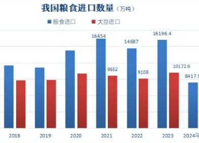7月12日,海关总署发布最新数据:2024年1-6月我国累计进口粮食量为8417.9万吨,同比增长4.7%;进口金额为2574.2亿元人民币,较去年同比减少13.9%。6月我国大豆进口量持续递增突破1100万吨,达到1111.4万吨,相比之下5月大豆进口量为1022万吨;2024年1-6月,我国进口大豆累计达到4848.1万吨,同比减少2.2%;2024年1-6月大豆累计进口金额为1789.6亿元