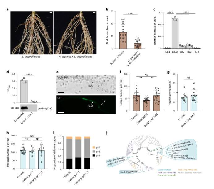 近日,中国农业科学院植物保护研究所与国内科研单位合作,揭示了大豆孢囊线虫通过分泌几丁质水解酶水解共生信号因子以破坏微生物-植物共生关系的分子机制,设计了该几丁质水解酶的抑制剂,提出了防治孢囊线虫的新策略。相关研究成果发表在《自然微生物(Nature Microbiology)》上。孢囊线虫寄生植物的主要危害之一是抑制固氮根瘤菌和菌根真菌(促进植物吸收磷和水分)等微生物与植物的共生关系。大豆孢囊线虫