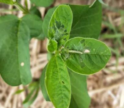 大豆卷叶螟又叫豆野螟,属鳞翅目螟蛾科,主要危害大豆、豇豆、菜豆、扁豆等豆科作物。以幼虫危害豆叶为主,3龄前喜食叶肉不卷叶,3龄后开始卷叶,4龄幼虫将豆叶横卷成筒状,潜伏在其中危害,有时数张叶片卷在一起,影响光合作用,组织受损后植株不能正常生长而减产。甜菜夜蛾,为杂食性害虫,主要危害玉米、大豆、花生、蔬菜等作物。幼虫3龄后,食量大增,昼伏夜出,严重时可吃光叶肉,仅留叶脉,一般可造成作物减产10-20